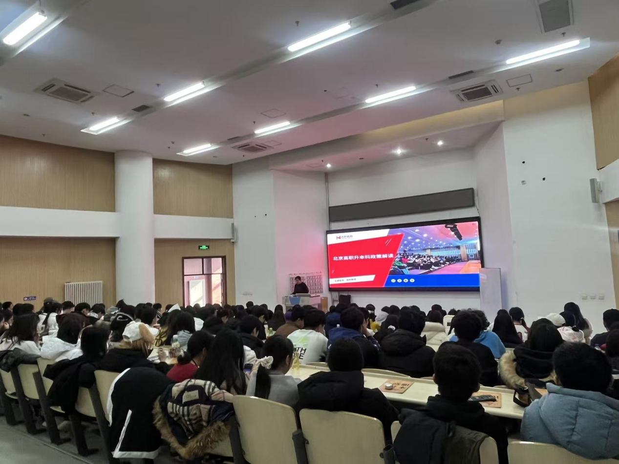 原北京联合大学招生就业处的高桥教授介绍了北京市各专业可对接的本科院校及专业,讲解了北京市历年专升本的录取情况及存在问题。就“为什么要升本”、“2026年如何备考”、“北京市公共英语统考考点”等向同学们做了说明,深刻剖析了专升本的重要性,引导学生将个人学业规划融入首都高质量发展和现代职业教育体系建设的大局,认识其对于优化人才结构、服务区域发展的长远价值。活动中同学们聚精会神,认真记录,主动收集关键信息,与相关人员进行了深入交流探讨。