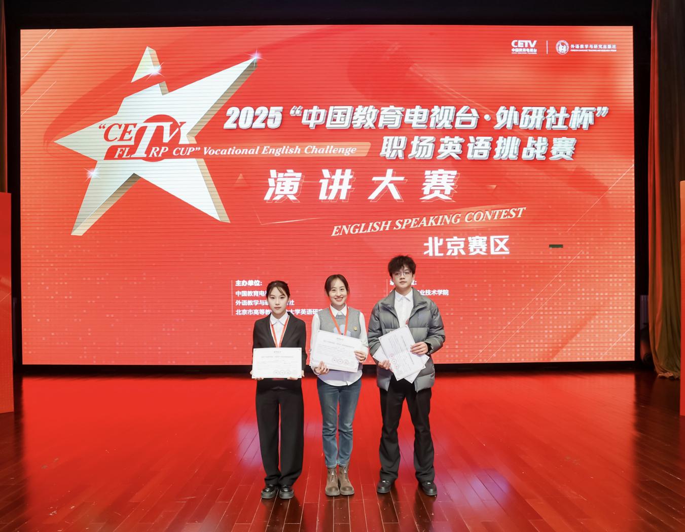 10月31日,2025“中国教育电视台·外研社杯”职场英语挑战赛演讲大赛北京市决赛在北京工业职业技术学院举行。全市18所高职院校52名选手同台竞技,经过激烈角逐,我校三名学生分获一、二、三等奖。